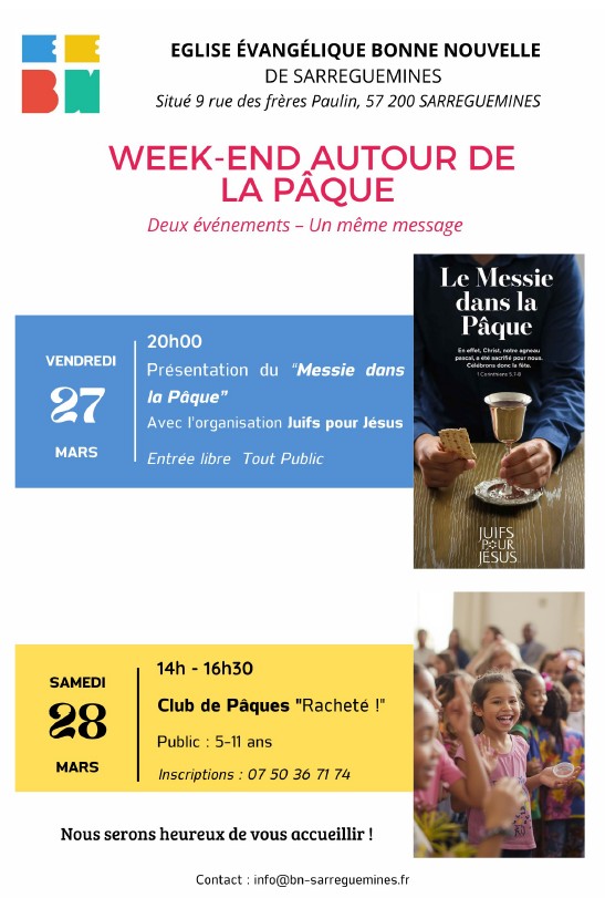 | Étude biblique (sauf vacances scolaires) | Le mardi de 20h à 21h |